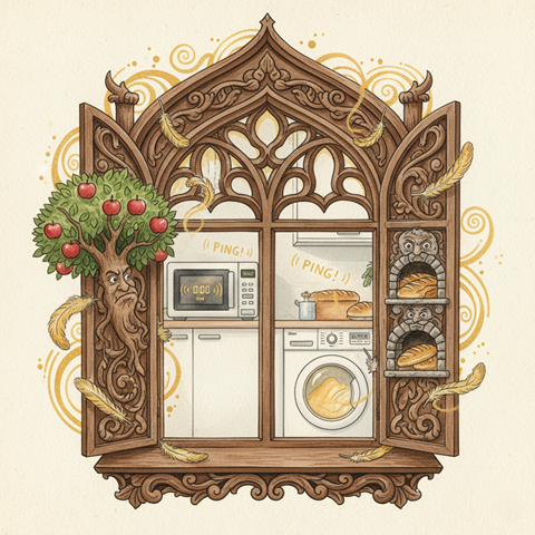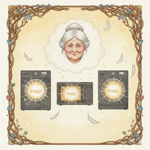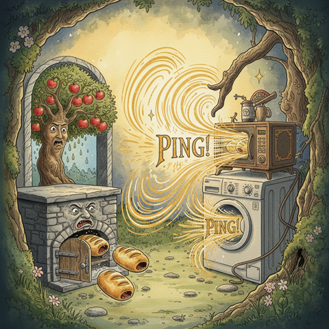 Als die Mikrowelle erfunden wurde, brauchte sie eine Stimme. Die Erfinder spielten verschiedene Töne vor – ein Summen, ein Klatschen, ein Läuten. Keiner fühlte sich richtig an. Einer der Techniker, ein Mann mit tiefen Träumen von Äpfeln und Brot, schlug einen kurzen, klaren Ton vor, der sofort Aufmerksamkeit erregte. Er nannte es "das Bestätigungsping". Unwissend hatte er Frau Holles Echo wiedergefunden.